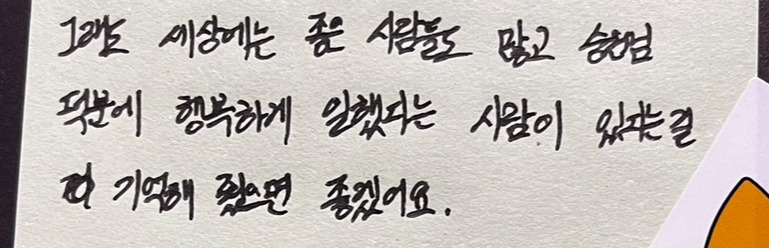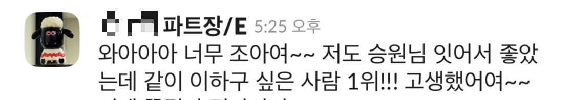번외) 퇴사 전 제가 정말 애정하던 동료분들이 좋은 말씀을 많이 해주셨습니다. 누군가 어떤 개발자가 되고 싶은지 물었을 때 항상 같이 일하고 싶은 개발자가 되고 싶다고 생각했었는데, 조금은 그 목표에 가까워진 것 같아 회사 생활을 행복하게 마무리할 수 있었습니다.